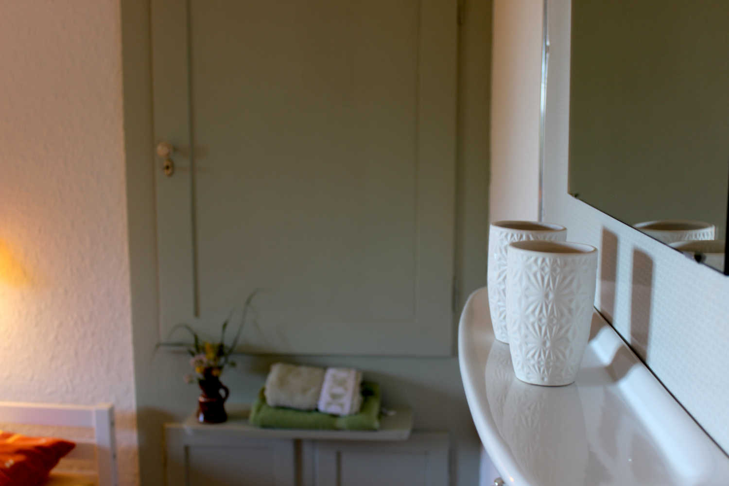 Eine Gemeinschaftsküche (mit Herd, Kaffeemaschine, Wasserkocher, Kühlschrank und Spülmaschine) befindet sich im Erdgeschoss und steht Ihnen für 10 Euro / Zimmer am Tag zur Verfügung.